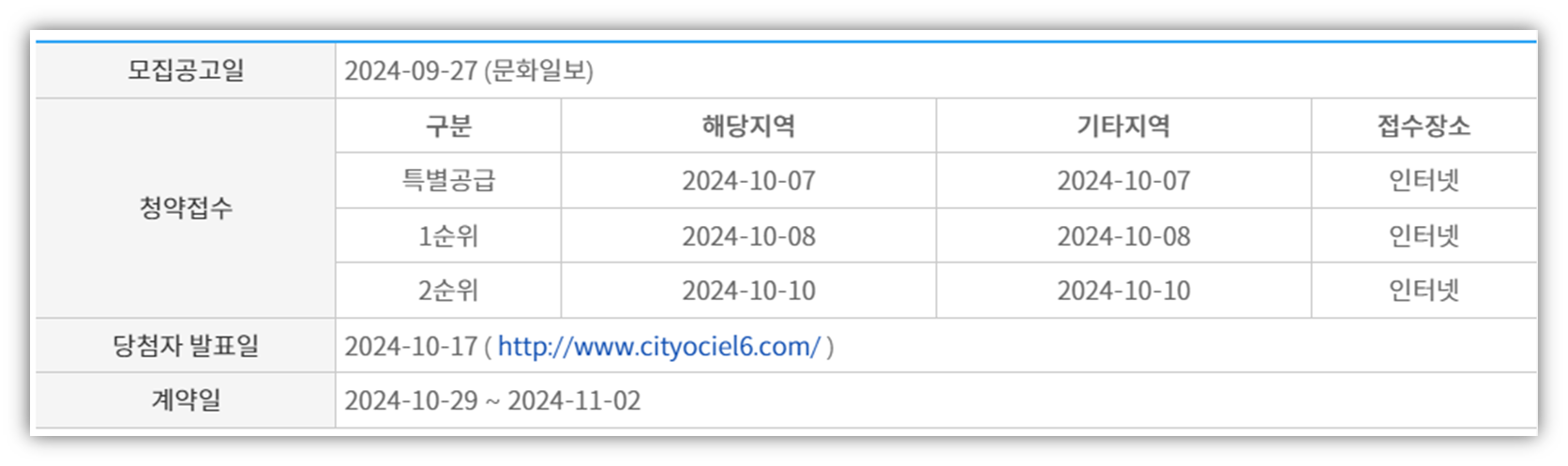 시티오씨엘 6단지의 청약은 10월 7일 특별공급을 시작으로 8일 1순위, 10일 2순위 청약을 받습니다.